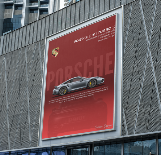Estos tres carteles fueron diseñados como simulación de publicidad del Porsche 911 Turbo S, combinando la fuerza visual del rojo, que transmite agresividad y deportividad, con el gris elegante del coche, que refleja sofisticación y distinción. Cada diseño busca resaltar el carácter potente y exclusivo del vehículo, jugando con el contraste de colores y la composición visual para atraer la atención del espectador y transmitir tanto dinamismo como elegancia. El proyecto permitió explorar la armonía entre color, forma y mensaje publicitario, aplicando principios de diseño gráfico orientados al marketing automotriz